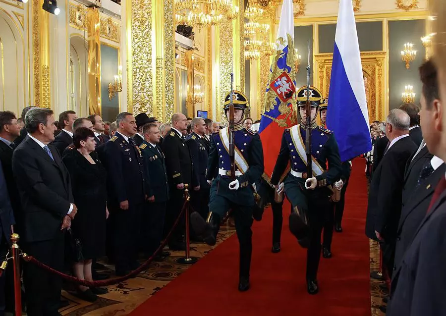 Под звуки марша знаменная группа внесла триколор в зал Русской славы и Побед